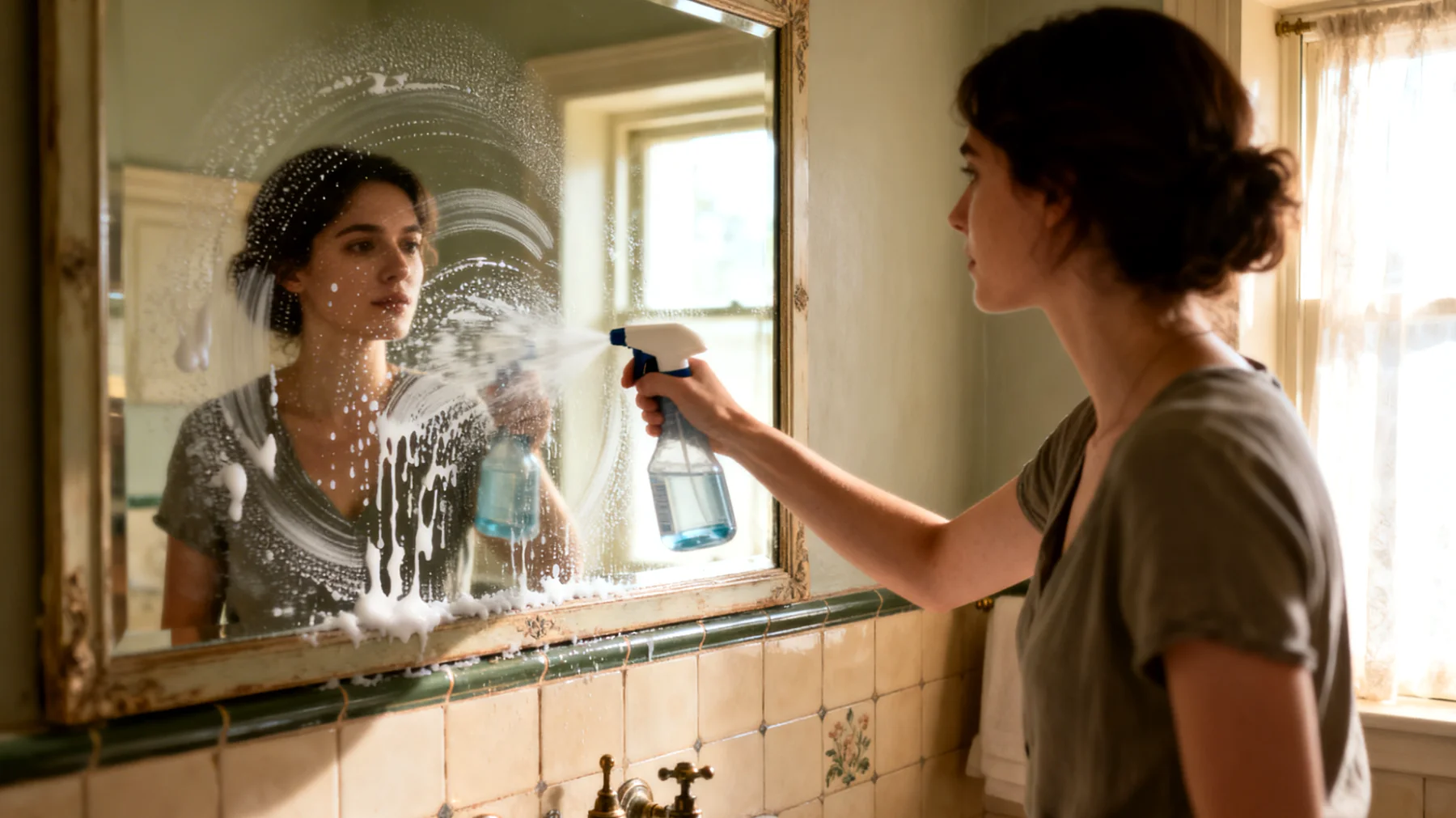 - Application homogène : Vaporisez le mélange de vinaigre blanc dilué sur toute la surface du miroir. Assurez-vous que le miroir est uniformément recouvert mais non trempé pour éviter les coulures excessives qui gaspilleraient le produit et créeraient des zones inégalement traitées. Maintenez le pulvérisateur à environ vingt centimètres du miroir et déplacez-vous méthodiquement de haut en bas, puis de gauche à droite, pour garantir qu’aucune zone n’est oubliée.